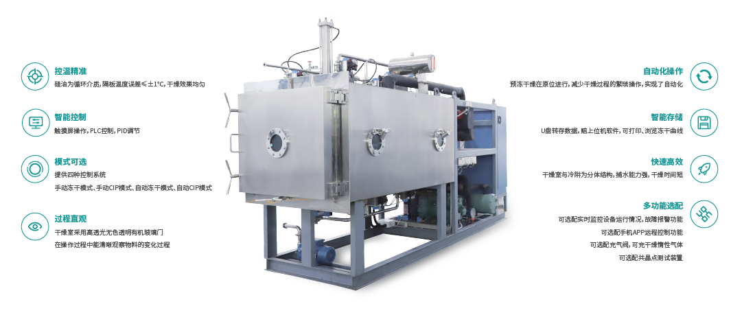 ? 多功能選配 可選配實時監(jiān)控設(shè)備運行情況,故障報警功能 可選配手機APP遠程控制功能 可選配充氣閥,可充干燥惰性氣體 可選配共晶點測試裝置 | ? 過程直觀 采用高透光有機玻璃門,能清晰觀察物料的變化過程 |
