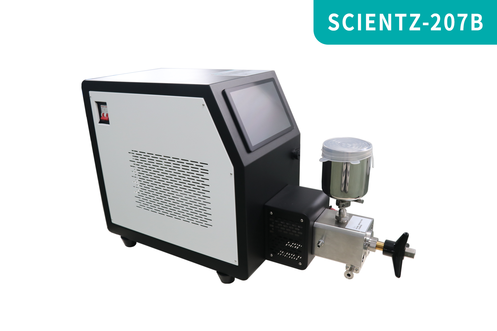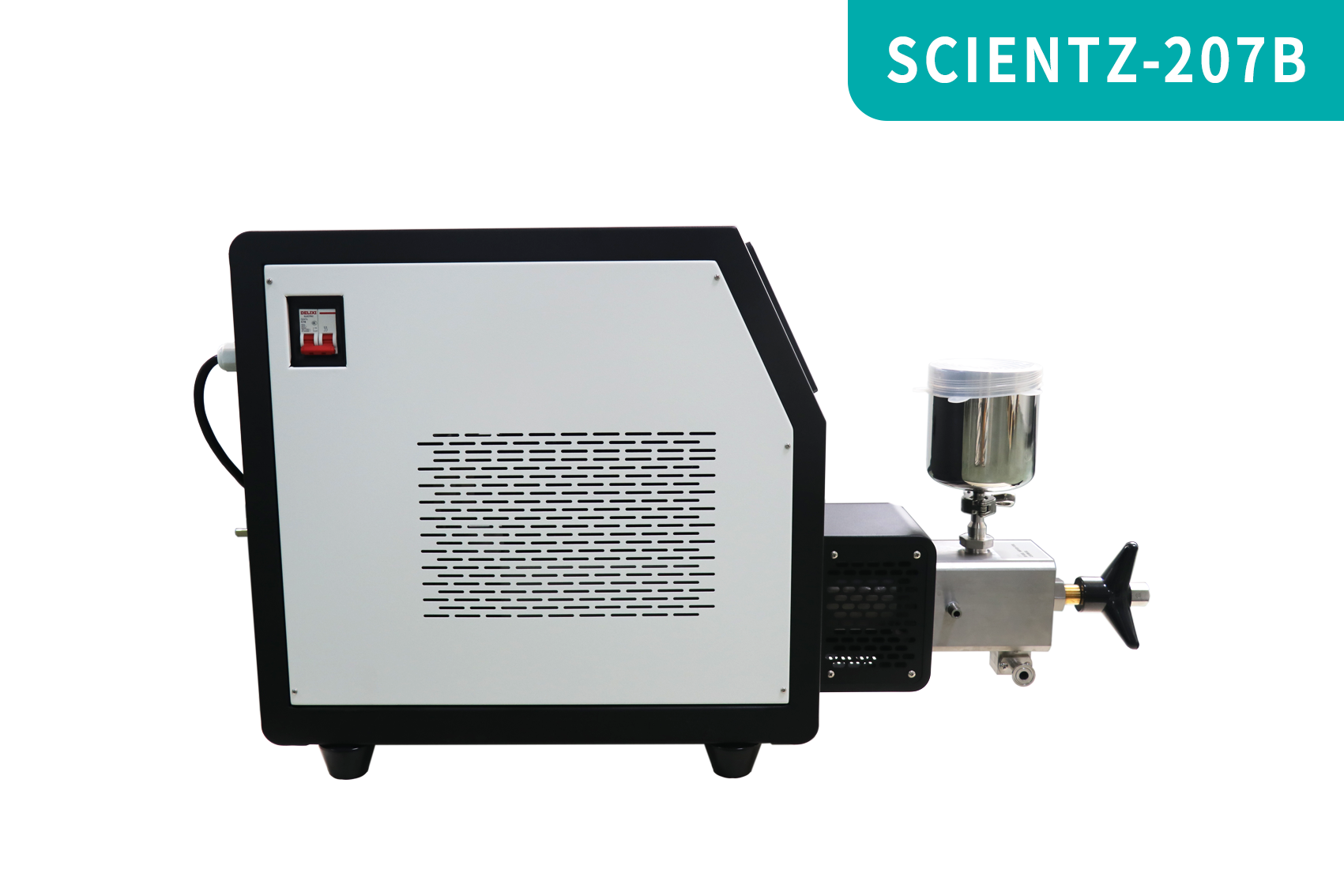 SCIENTZ-207A超高壓均質機是一種小型化的臺式生物樣品處理裝置,可實現(xiàn)生物實驗室和小規(guī)模生產(chǎn)中的細胞粉碎或物料均質。不同的樣品通過控制壓力、流量、氣蝕、沖擊、剪切和過程持續(xù)時間來達到破碎、乳化和分散效果。另設有冷卻循環(huán)系統(tǒng)接口,搭配恒溫槽有效控制溫度,提升均質效果??蛇m用于制藥、生物技術、化妝品、食品飲料、石墨烯等領域的高校、研究所、企業(yè)研發(fā)實驗室。