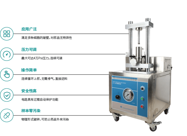 ? 應(yīng)用廣泛 滿足多種細(xì)胞的破壁,對樣品無特異性 | ? 壓力可調(diào) 最大可達(dá)40000 PSI壓力,連續(xù)可調(diào) |